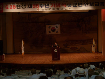 순창군 재향군인회(회장 허규성)는 6ㆍ25전쟁 제 55주년 기념행사 및 자유와 평화수호를 위한 안보결의대회가 24일 대한민국 무공수훈자회 전주시(지회장 김창호) 강사의 안보강연이 있는 후 2부 기념행사에서 강인형 군수, 양영수 군의장, 김현석 교육장, 김종길 경찰서장을 비롯한 강대희, 김병윤 도의원, 군의원 각급 기관장, 참전회원, 보훈회원, 향군회원 500여명이 참석한 가운데 복지회관에서 제 55주년 6ㆍ25 기념식 및 참전용사와 호국영령의 뜻을 기리고 위로하는 시간을 가졌다.