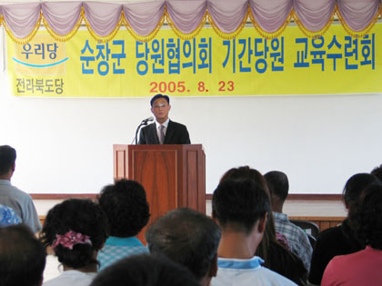열린우리당 전라북도당 순창군당원협의회(협의회장 노기성)는 24일 팔덕면 복지회관에서 순창군당원협의회 김문소 교육위원으로부터 팔덕면 기간당원 교육연수회를 실시했다.(사진)