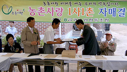 금과농협(조합장 김석환)은 지난 18일 농촌이 도시와 함께 발전할 수 있도록 상호교류활동을 증진하고 농촌사랑을 실천하기 위한 일환으로 국립농산물 품질 관리원과 1사1촌 자매결연을 맺고 농촌 사랑 실천에 나섰다.(사진)