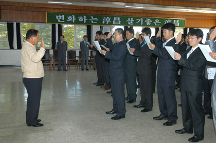 <사진설명 : 산반기 중 공채로 임용된 신규 공무원이 군민에게 봉사하고 책임을 다하겠다는 선서를 하고 있다.>