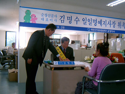 국민건강보험공단 순창지사(지사장 하지종)는 지역내 군민들에게 양질의 서비스를 제공하고 보다 친근감 있는 공단으로 거듭나기 위한 시책을 개발 26일 일일 명예지사장으로 본사 김명수 대표이사를 위촉하여 근무토록 했다.