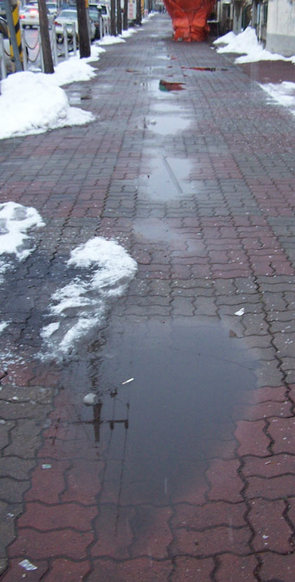 대부분 지난 2000년을 전후로 해서 보도블록이 교체된 인도 가운데 여러 구간에서 침하현상이 일어나 물이 고이거나 틈새가 벌어져 흔들리고 아예 보도블록이 빠져나가고 없는 곳마저 발생했다.