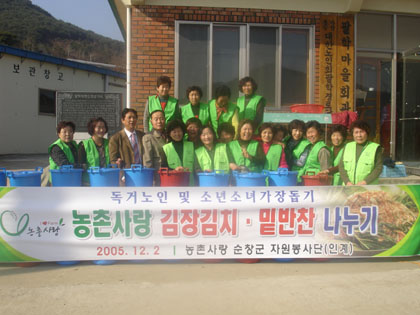 농촌사랑 순창군 자원봉사단(단장 유휘근) 50여명은 2일 인계면과 팔덕면에서 농촌사랑 김장김치, 밑반찬 나눔행사를 펼쳤다.<사진>