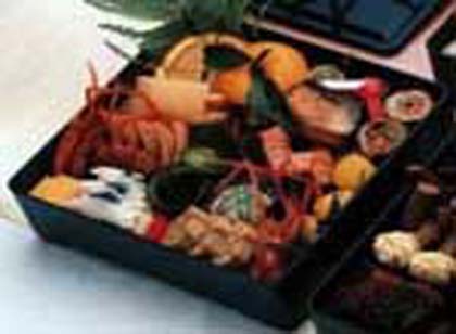 찬합에다 오세치 요리를 차곡차곡 쌓아놓고 끼니때마다 조금씩 꺼내 먹는 것으로 재료마다 깊은 뜻이 담겨있다. 구멍이 송송 나 있는 연근은 지혜의 눈을 갖는 믿음을 의미하고, 긴 수염이 달린 새우는 장수를, 검은 콩은 열심히 노력하라는 의미며, 다시마는 일년 내내 좋은 일만 생기기를 기원한다는 의미라 한다.