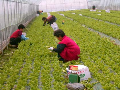 .jpg) 공판장에 출하하기 위해 상추를 수확하고 있다. 구림 상추작목반은 현재 나 씨가 경작하는 재배면적은 2,500여평을 포함 일대 하우스 9천여평에 노지재배까지 합치면 15㏊를 재배했다.