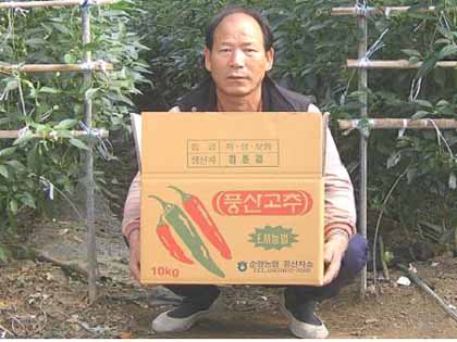 .jpg) 지금까지 경영기록을 보면 수확완료 후 토양개량을 마치고, 전년 7월 15일~9월 5일에 정식 후 11월 초순부터 수확 현재까지 6,000여 상자를 생산하고 있는데 전 농가 농산물 생산이력제를 추진하여 농가별로 친환경품질인증 라벨 부착으로 도시소비자에게 품질을 인증 받고 있어 타 지역 농산물보다 10%이상 소득을 높이고 있으며, 금년 5월말까지는 전체적으로 12,000여 상자의 친환경품질인증 고추를 생산할 수 있을 것으로 본다.