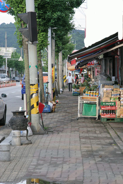 .jpg) 보행자들의 안전지대이자 공간이어야 할 인도가 인근상점들의 감당하기 힘든 양의 물건을 야적해놓고 판매하는 바람에 많은 주민이 어려움을 겪고 있다.