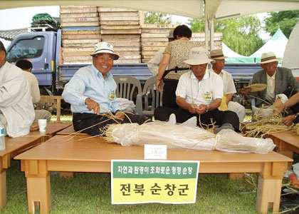 사라져 가는 노인들의 전통 장인기술을 보존하고 삶의 활력소를 제공하기 위한 제3회 전국 노인솜씨경연대회가 지난 7일 무주군 지남공원에서 개최됨에 따라 장수복지과 가정복지계(담당 전귀례)는 유등면 노인회(회장 임낙범) 회원 6명을 짚풀공예부문에 출전시켰다.