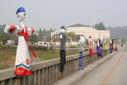 각기 다른 얼굴과 모양으로 소탈하면서도 농촌의 마음을 그대로 제현한 채로 생명을 가진 것 같은 표현을 하고 있는 허수아비는 현재 제각각 자신을 뽐내기라도 하듯 주민들의 갈 길을 잡고 있다.