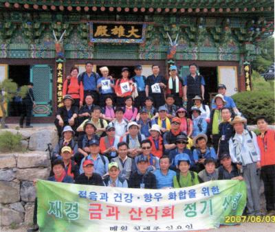 도시의 콘크리트 숲을 떠나 산과 바다, 평야가 조화롭게 어우러진 변산반도를 찾아 내소사, 직소폭포, 재백이고개, 불멸의 이순신 촬영지를 두루 살필 수 있는 좋은 시간을 갖었다. 금과산악회 김경곤 명예회장은 인사말에서 “평소 생활에 묶여 지척에 살면서 안부조차 나눌 수 없는 향우가족이 오늘 산행을 통해서 고향을 생각하고 향우간에 우정을 나눌 수 있게 된 것을 감사하게 생각한다.”고 말하고 하동보 산악회장은 “재경금과 산악회가 더욱 애향심을 발휘하여 향우회와 고향이 하나가 되도록 협력을 아끼지 않았으면 좋겠다.”고 인사했다.