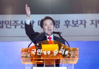 정 후보는 지역선거인단 투표와 휴대전화 투표, 여론조사를 합산한 결과 총 21만6,984표를 얻어 손학규 후보 16만8,799표와 이해찬 후보 11만128표를 제치고 대선후보로 선출됐다.