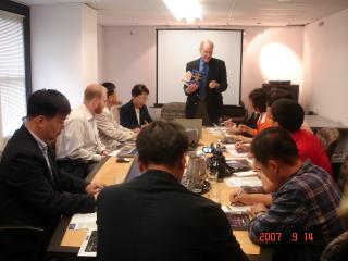 <수해복구를 심층보도해 예산낭비를 지적한 공공책임성 센터의 부젠버그 사무총장과 취재단의 면담보습>