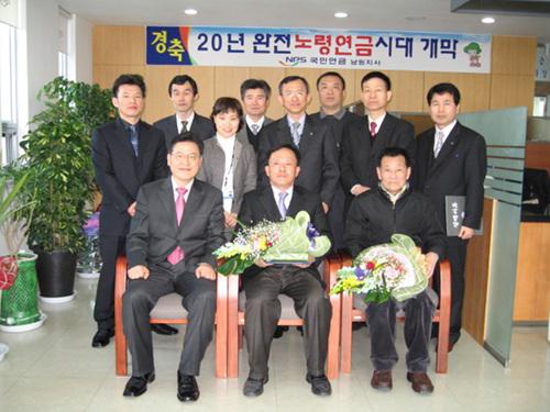 국민연금공단 남원지사(지사장 김종재)는 지난달 28일 20년 완전노령연금 지급 개시를 축하하기 위해 지역에서 처음으로 탄생한 완전노령연금 수급자 2명을 초청하여 연금수급 증서를 전달했다.