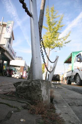 차도와 인도를 분리하도록 쇠파이프와 쇠사슬로 연결된 가드레일이 제 기능을 발휘하지 못하고 주민정서와 시가지 미관을 저해하고 있어 군이 정비에 나섰다.<사진>