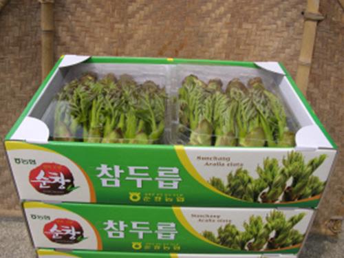 순창 참두릅은 4월 중순부터 출하되고 있으며, 첫순 특품으로 1kg 박스당 17,000원을 호가하고 있어 농가 소득 작목으로 각광받고 있다.